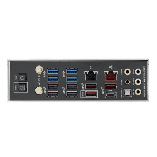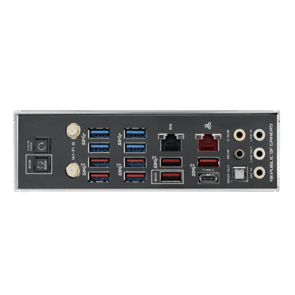 Equipped with on-board Wi-Fi 6 (802.11ax) supporting MU-MIMO, 5G, and Gigabit Ethernet via Aquantia and Intel, reinforced by ASUS LANGuard protection and GameFirst V software.