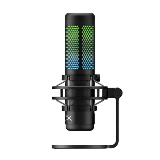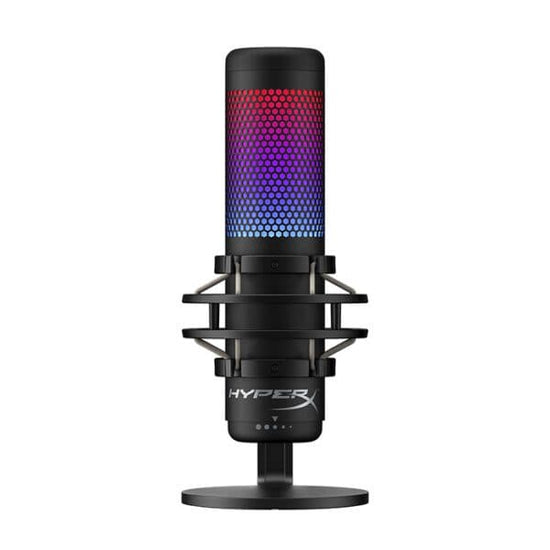 Introducing the HyperX QuadCast S: The ultimate comprehensive standalone microphone catered to emerging streamers and podcasters seeking top-tier sound quality from a condenser microphone. The QuadCast S comes equipped with its own anti-vibration shock mount, effectively minimizing the intrusion of everyday vibrations, and a built-in pop filter to suppress bothersome plosive sounds. A user-friendly LED indicator ensures swift monitoring of your microphone's status, while the tap-to-mute feature prevents unexpected broadcasting mishaps. Offering a selection of four polar patterns, this microphone is adaptable to virtually any recording context and features an easily accessible gain control dial for swift adjustments to mic sensitivity. The package includes a mount adapter compatible with both 3/8” and 5/8” thread sizes, making it adaptable to most stands. The QuadCast S model introduces vibrant RGB lighting and dynamic effects, customizable through the HyperX NGENUITY software.
